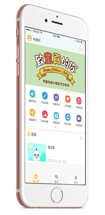 家園互動APP功能考慮細致且應用簡便,擁有“家長端”和“園丁端”兩個版本。有“作業課程、校園簡介、新聞通知、健康成長、留言互動、時光相冊、天天食譜、快樂天地”等功能。【阿童目】客戶端更快捷的了解兒童在園動態,關注兒童健康成長,實現家園共育。